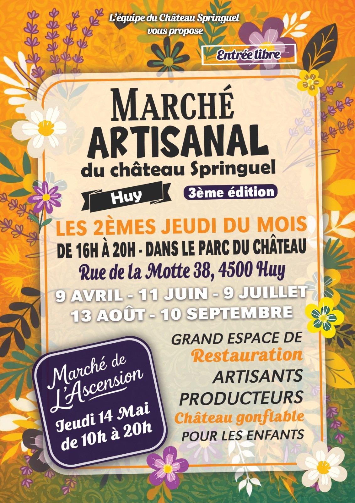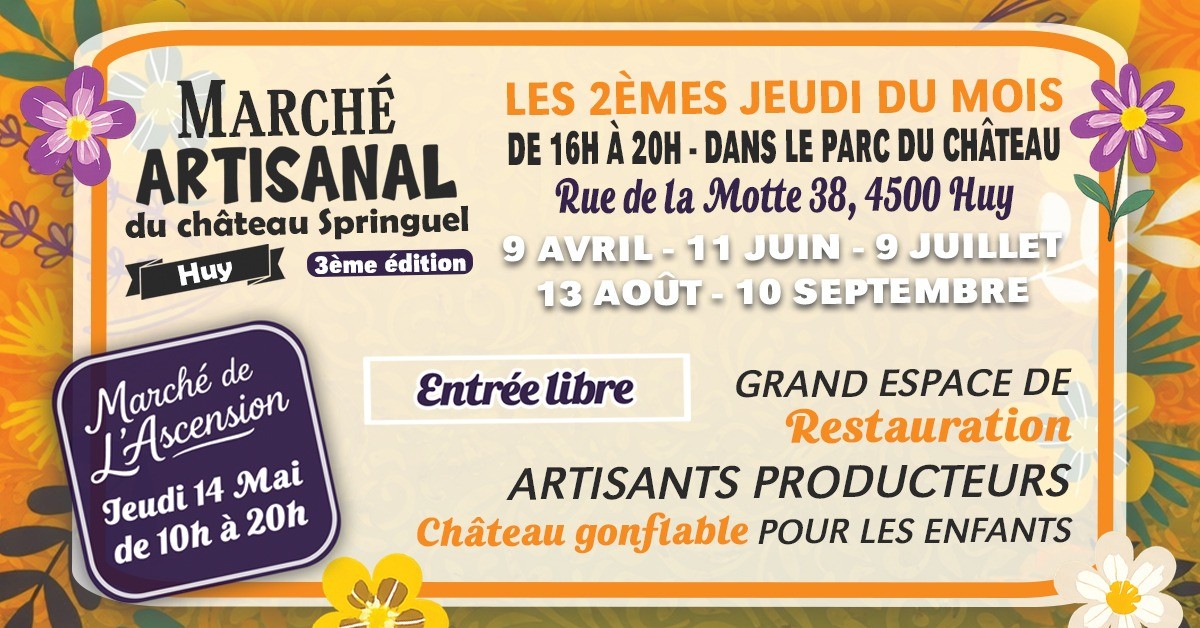 Le Marché Artisanal du Château Springuel à Huy vous accueille chaque 2ᵉ jeudi du mois de dans le parc du château. Artisans, producteurs locaux, espace restauration et château gonflable pour les enfants vous attendent dans une ambiance conviviale et familiale. Entrée libre !